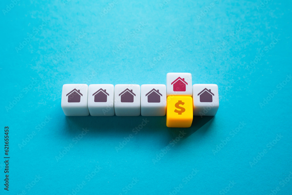 House selection and purchase. Make a selection of the best home. Choice checked with a dollar symbol. Real estate market offers. Weighs the pros and cons of each option.