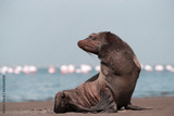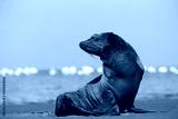 Lonely brown fur seal sits on the ocean on a sunny morning