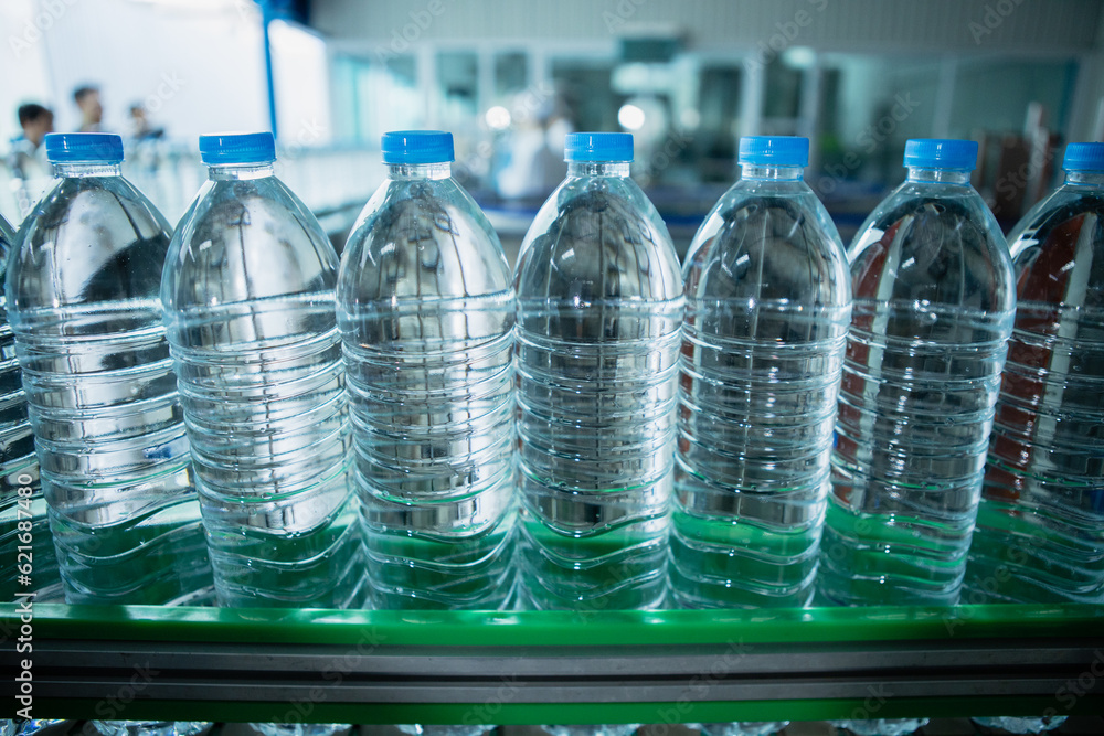 Drinking water plant. Selective focus water bottles on production line of factory. Process of filling water into plastic bottles to bring out to consumers.