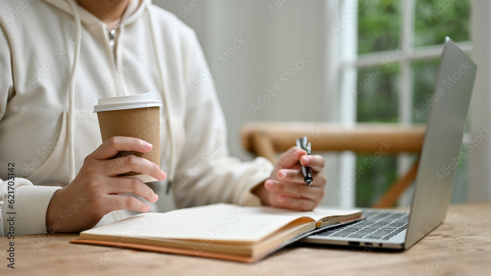 A young Asian woman sipping coffee and doing her homework in a coffee shop.