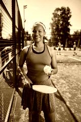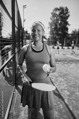 Happy black woman playing pickleball on outdoor court and looking at camera.