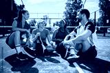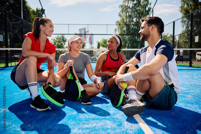 Group of athletic friends talk while relaxing after playing paddle tennis on outdoor court.