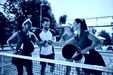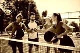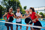 Happy paddle tennis players joining hands in unity while celebrating after match.