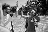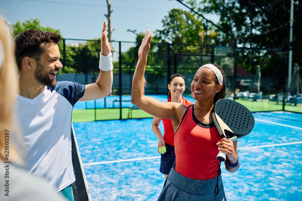 Happy black paddle tennis player giving high five to her rival after playing mixed doubles match.