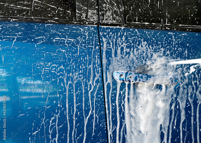 Blue car wash with white soap foam and professional auto care service. Car cleaning service concept. Vehicle cleaning service. Foam wash car detailing. Blue luxury SUV car is covered with white foam.