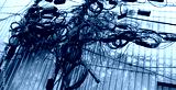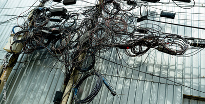 Tangled electrical wires and tangled communication lines on urban electric poles create a chaotic network. Disorganized and messy to organization management concept. Should take underground wire.
