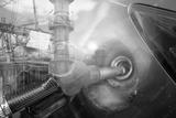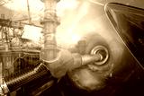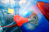 Car fueling at gas station. Refuel fill up with petrol gasoline. Blur industrial gas storage tank and petroleum refinery plant. Petrol industry and service. Petrol price and oil crisis concept.