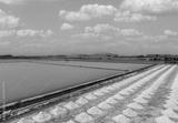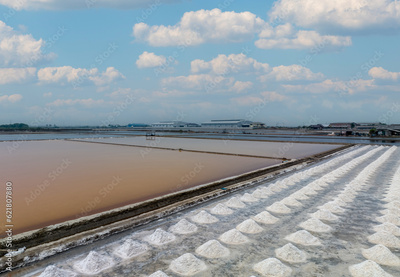 Aerial view of sea salt farm. Pile of brine salt. Raw material of salt industrial. Sodium Chloride mineral. Evaporation and crystallization of sea water. White salt harvesting. Agriculture industry.