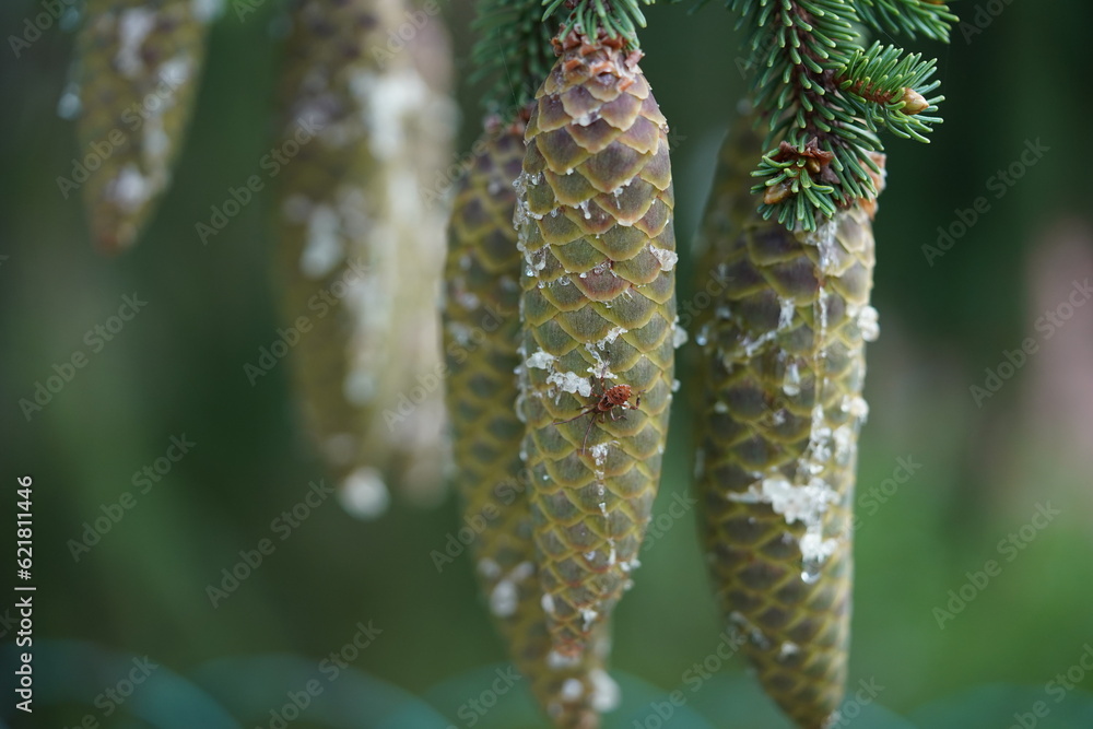 western conifer seed bug, Leptoglossus occidentalis, resting on a pine cone