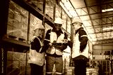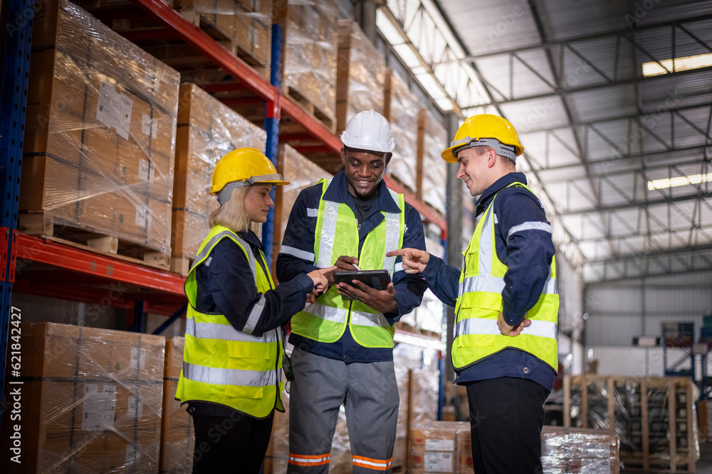 Industry warehouse worker in safety uniform check order details and checking goods supplies on boxes shelve in workplace warehouse industry logistic export import distribution business concept.