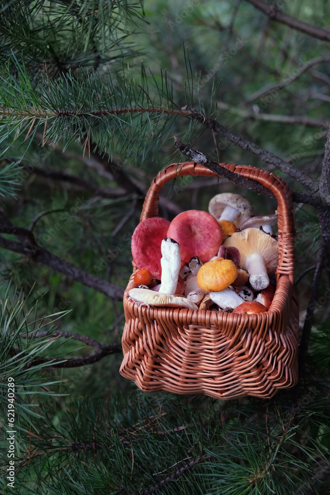Wicker basket with edible mushrooms close up on pine tree branch, abstract forest background. Beautiful image of wild nature. harvest season, picking fungi. wild Forest aesthetic. template for design