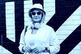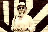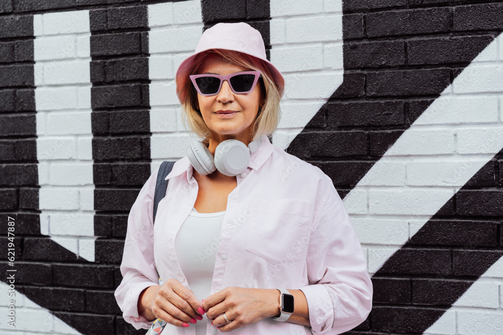 Smiling stylish middle aged woman in bright sunglasses, pink t-shirt, bucket hat and wireless headphones walking near city urban painted wall background. Aged Urban city street fashion. Forever young.