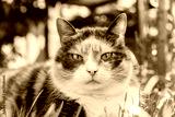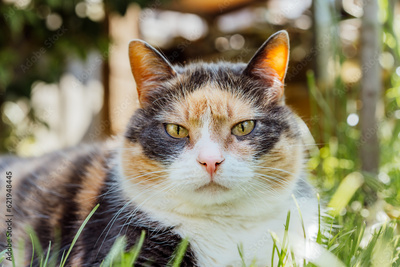 Close up portrait of multicolor pleased, well-fed cat lying on the green grass in the garden. Fluffy cat relaxing in shadow outdoors on a sunny summer day. Pets in the Summer heat. Selective focus