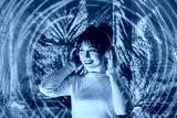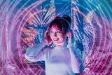 Portrait of relaxed smiling woman in white clothes and headphones dancing in neon light. Music lover. White dress code party. Silent disco. Enjoy moment on shiny background. Selective focus.