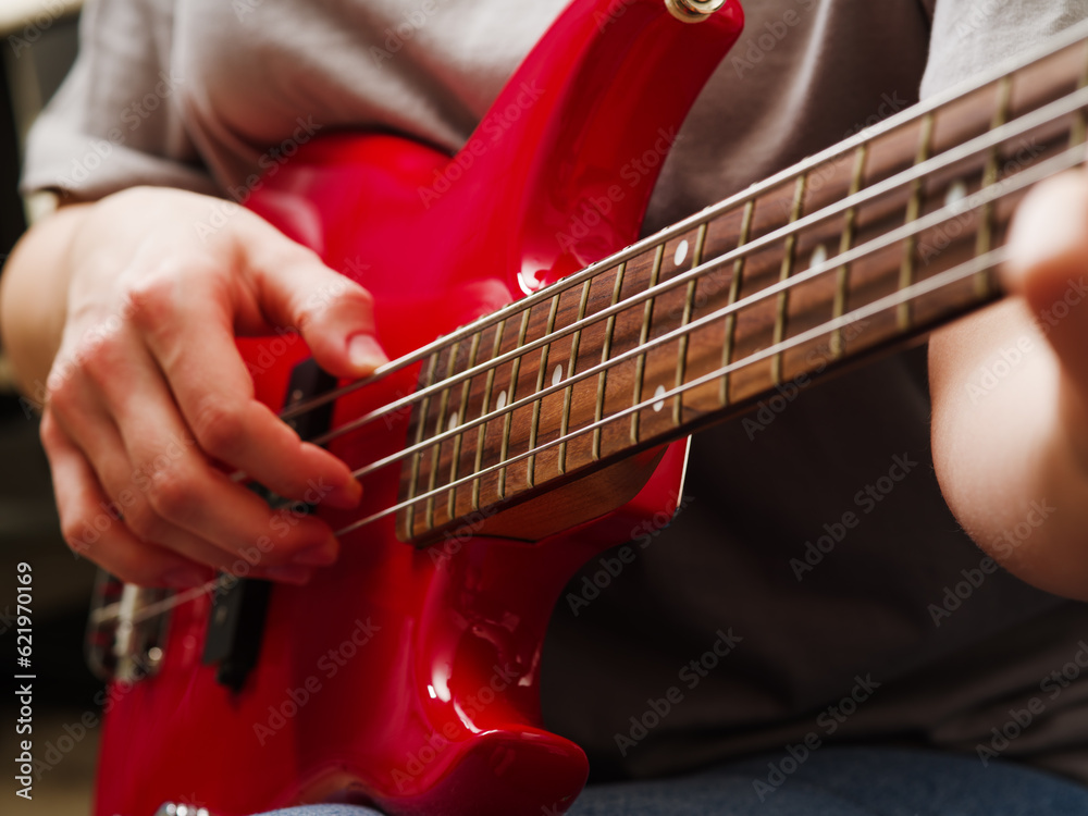The musician plays the electric guitar. Close-up. Profession, hobby, concert, sound recording.