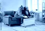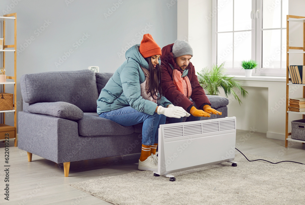 Portrait of a young frozen couple sitting on the sofa in the living room in winter outerwear and hats at home and trying to warm their hands on electric heater. Heating problems concept.