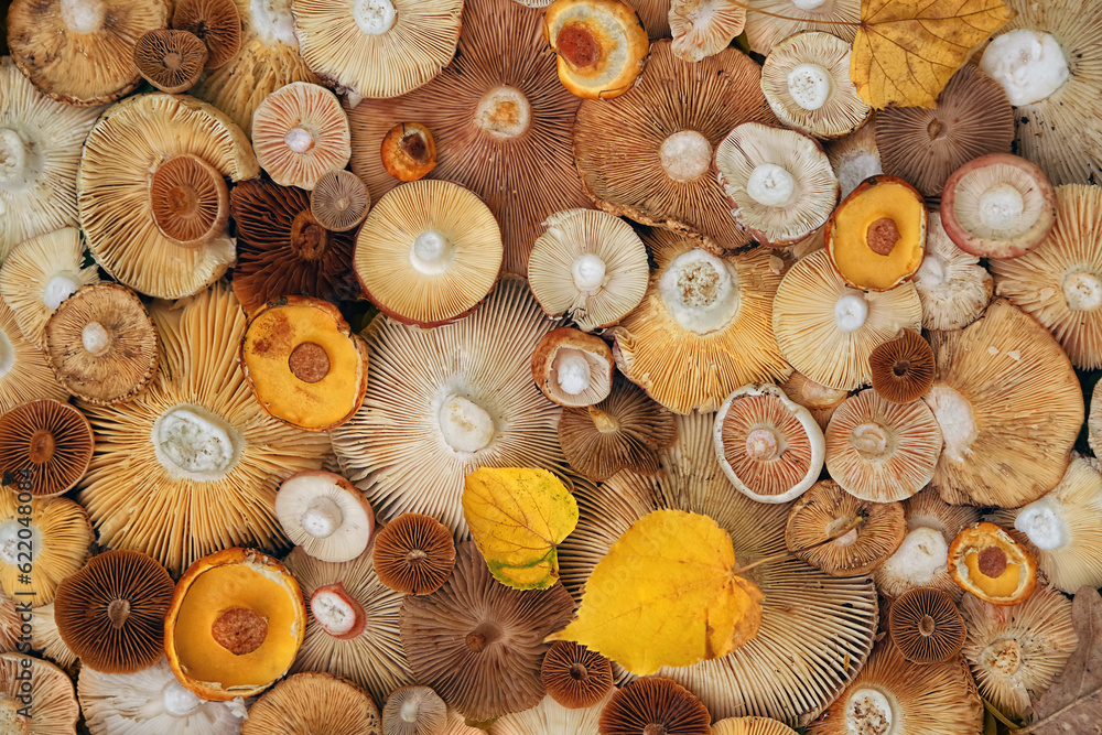 texture of many fresh mushrooms caps close up, abstract natural background. mix of forest mushrooms. symbol of harvest season, picking fungi. wild nature aesthetic. top view. template for design