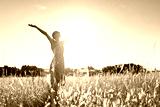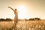 Joyful Person Raising Arms morning in Rural Field Under Summer Sunlight