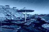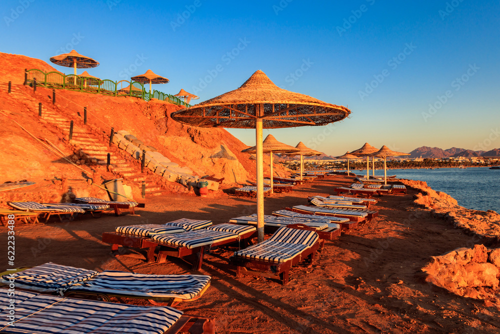 Sun umbrellas and chaise lounges on tropical beach. Concept of rest, relaxation, holidays, resort