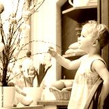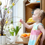 toddler girl decorating with Easter eggs cherry tree branches