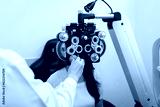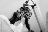 Woman optical shop customer doing eyesight measurement with optical phoropter check eye distance for eyeglasses is optical eye shop service