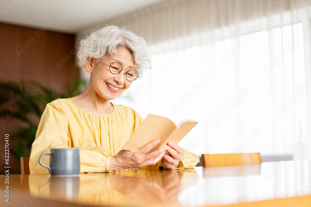 老眼鏡をかけて本を読んでいる日本人シニア女性