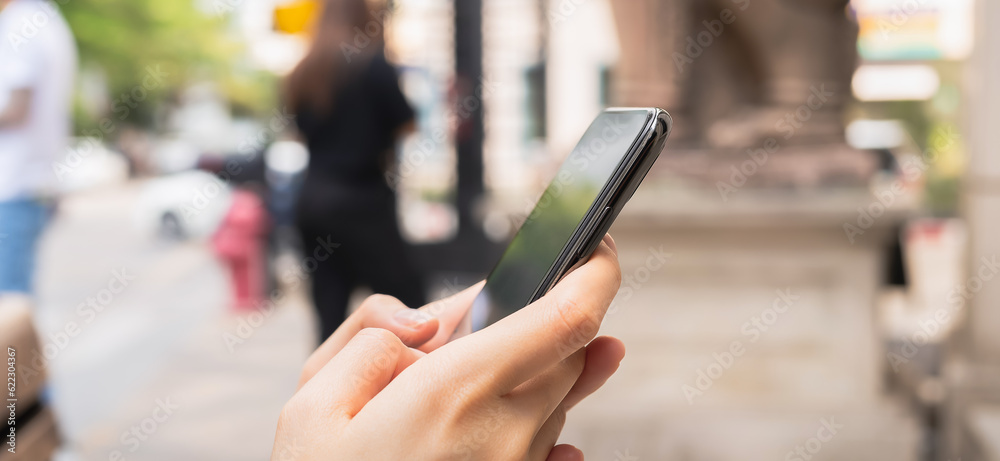 Hand using smartphone in public areas, During leisure time. The concept of using the phone is essential in everyday life.