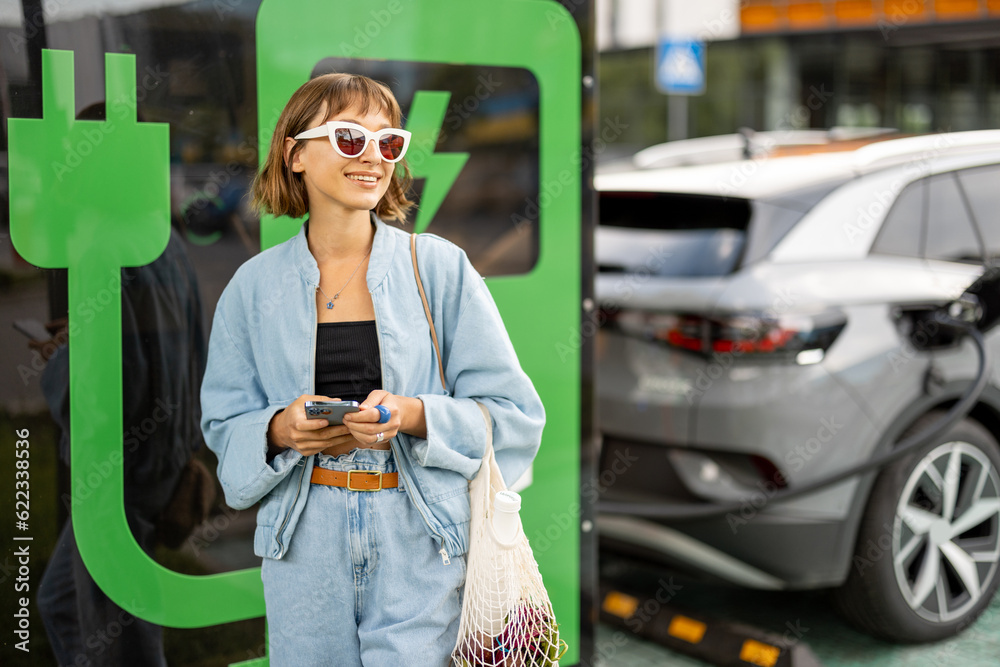 Young woman stands with a smart phone and mesh bag with some food, waiting for her electric car to be charged on a public station outdoors. Concept of sustainable lifestyle and green energy