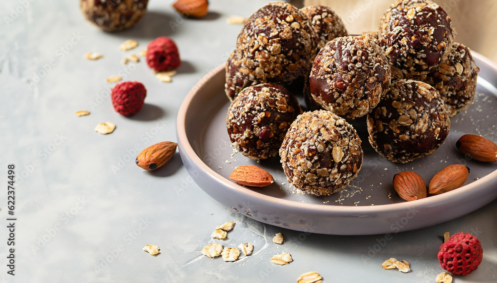 Healthy homemade paleo, hight protein chocolate energy balls with rolled oats, nuts, dates and almond flakes, dried raspberries. Raw vegetarian sweets. Sugar free, gluten free. Banner, copy space