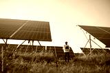 Photovoltaic Green Energy Technology. Worker At Solar Panel Plant