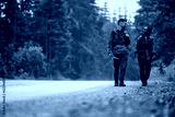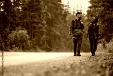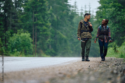 Multiracial couple walks by road while hiking in woods.