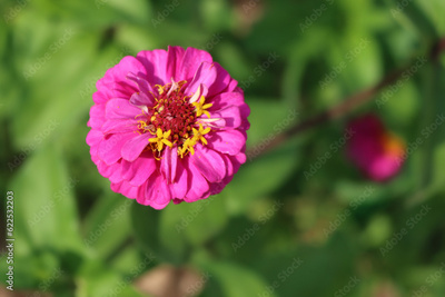 Pink Zinnia plant in bloom in the flowerbed on summer