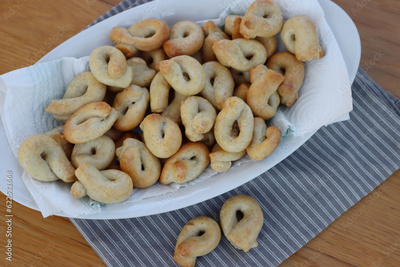 Homemade traditional italian snack from Puglia called Taralli on a white bowl on wooden table