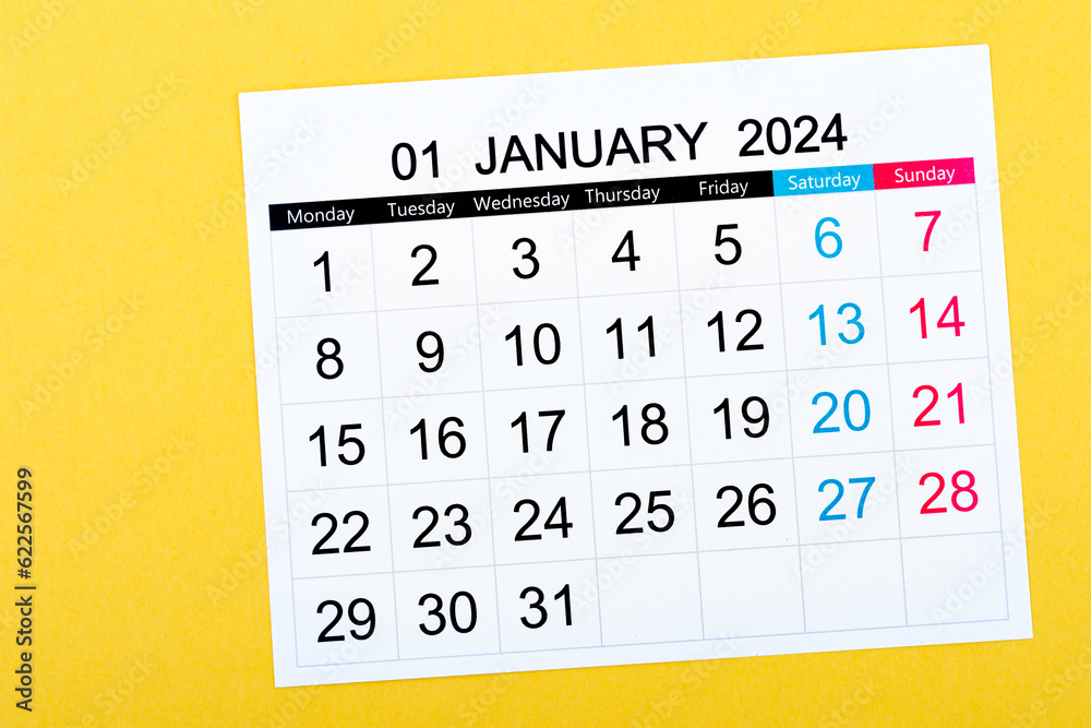 Calendar Desk 2024: January is the month for the organizer to plan and deadline with a yellow background.