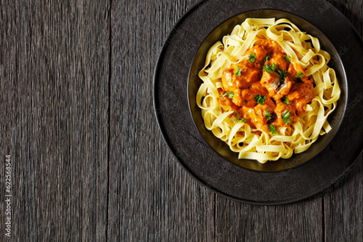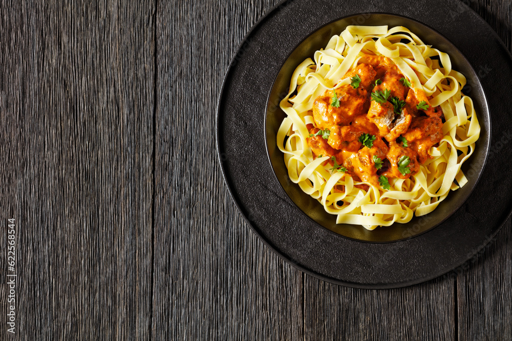 Creamy Paprika Pork Chunks over tagliatelle noodle