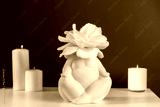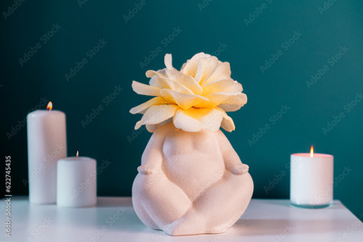 Close up white table with ceramic female body-shaped vase with rose flower, burning candles on turquoise blue wall background. Zen, cozy, meditation female bedroom decor. Self recovery place at home.