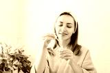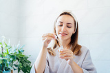Young woman in bathrobe looking in the mirror, holding dropper with hyaluronic acid serum close to face and smiling. Skin hydrating. Cosmetic spa procedures. Beauty self-care at home. Selective focus