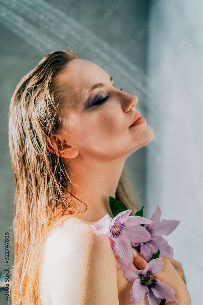 beautiful slim sexy nude female with long hair and healthy skin in the shower. Seductive woman with closed eyes purple makeup and perfect naked body covered up with purple flowers enjoys the moment.