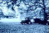 Removing fallen autumn leaves in the park, process of raking and cleaning the area from yellow leaves, regular seasonal work with tractor, garden tools and modern equipment.