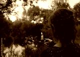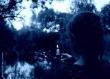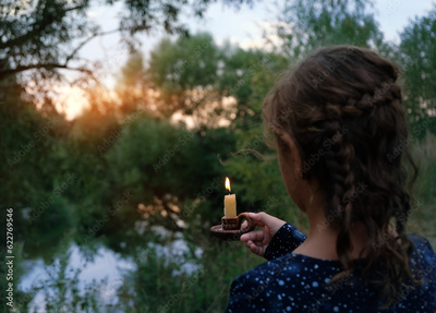 Girl hold burning candle in candlestick outdoor, abstract blurred natural background. religion, memory concept. magic, spiritual esoteric ritual. witchcraft, occultism, wicca. fairytale, mystery image
