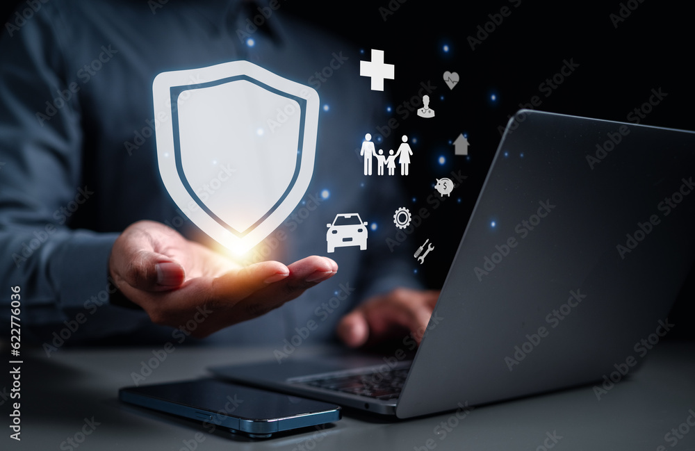 insurance, protection, assurance, family, health, saving, finance, life, shielding, healthcare. businessman typing on keyboard with shield hud, symbolizing life insurance and asset protection.
