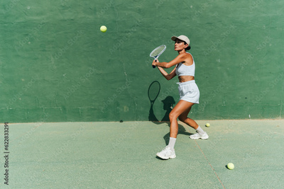 beautiful girl in a cap plays tennis on the tennis court against the background of a green wall