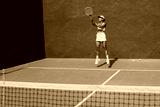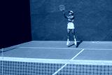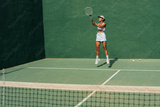beautiful girl in a cap plays tennis on the tennis court against the background of a green wall
