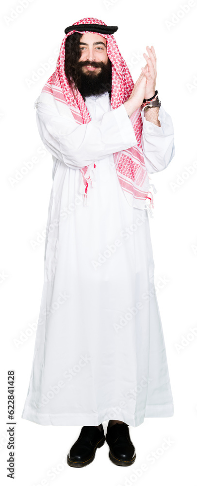 Arabian business man with long hair wearing traditional keffiyeh scarf Clapping and applauding happy and joyful, smiling proud hands together