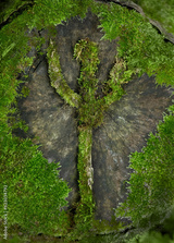 Rune Algiz from mossy tree branches on old stump close up, abstract natural background. Scandinavian runes use of predicting future, divination. Algiz symbol of protection, revival , magic awakening