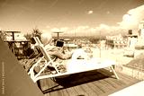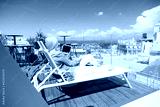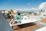 Two women, laptops in hand, lounging on a hotel terrace, embracing the view.