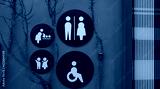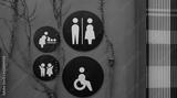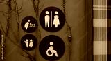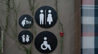 Public toilet sign. Woman, men, children, baby diaper changing, and disabled person toilet icon on restroom wall. Public restroom universal icon. Disabled access symbol. Latrine or WC. Washroom sign.