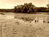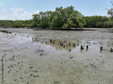 Carbon capture concept. Natural carbon sinks. Mangrove trees capture CO2 from the atmosphere. Green mangrove forest and mudflat. Blue carbon ecosystems. Mangroves absorb carbon dioxide emissions.