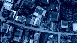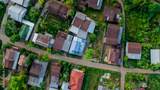 Aerial View of a serene rural village with green garden in Northeast Thailand. Tranquil landscape and authentic cultural heritage. Rural community in Thailand with old galvanized roof. Rural building.