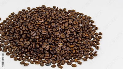 A lot of roasted coffee beans which have been scattered all over the surface used as a background